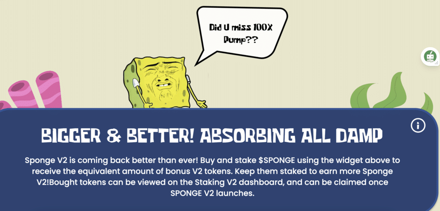Sponge V2 is a trending new upgrade building on the remarkable success of the original $SPONGE. The first version caught the market’s attention, rising to a $100 million market cap and producing a staggering 100x return to early investors.