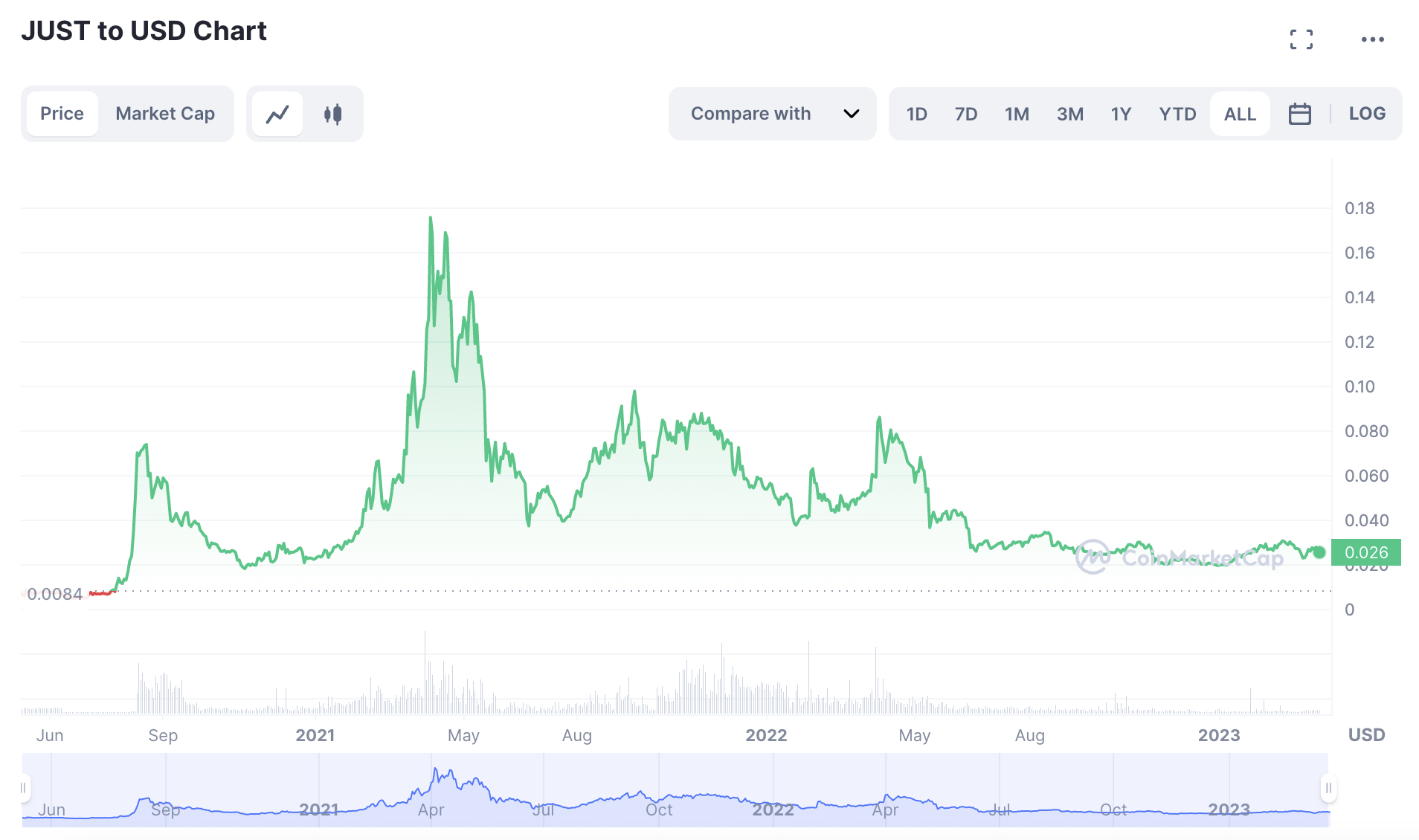 JST is the project’s native governance token, enabling holders to cast votes on how JUST is run. Users can also mine JST for additional rewards. When JUST was launched in 2020, it was trading at just $0.0084. As of writing, JUST is worth $0.026 per token – representing growth of 200%. This translates into a market capitalization of $228 million.