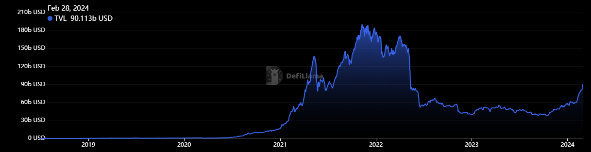 According to DefiLlama, TVL is currently $90.113 billion. The last time it stood at this level was May 2022.